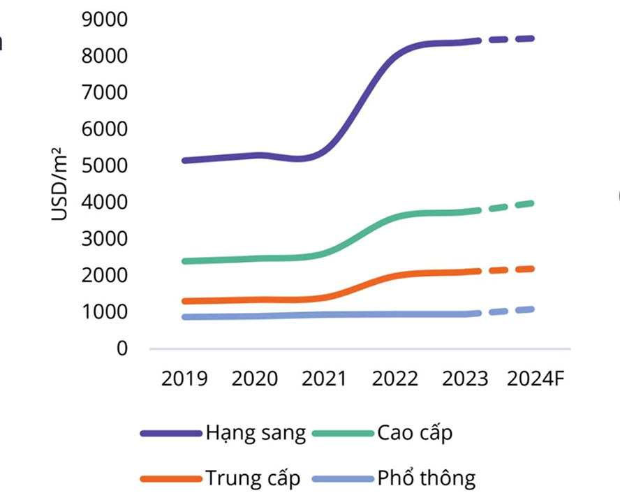 Theo bà Phạm Ngọc Thiên Thanh, Trưởng bộ phận Nghiên cứu và Tư vấn của CBRE tại Tp.HCM, từ trước nay thị trường căn hộ sơ cấp không thấy xu hướng giảm giá. Ở thị trường thứ cấp xuất hiện giảm giá nhưng cục bộ, không đại diện cho toàn thị trường chung cư. Một số dự án tạm ngưng 2-3 năm sẽ bán ra thị trường với mức tăng 10-30% so với định giá thời điểm trước đó. Điều này cho thấy sự kì vọng về từ phía chủ đầu tư cũng như các chi phí đầu vào gia tăng tạo mặt bằng giá mới cho thị trường.
