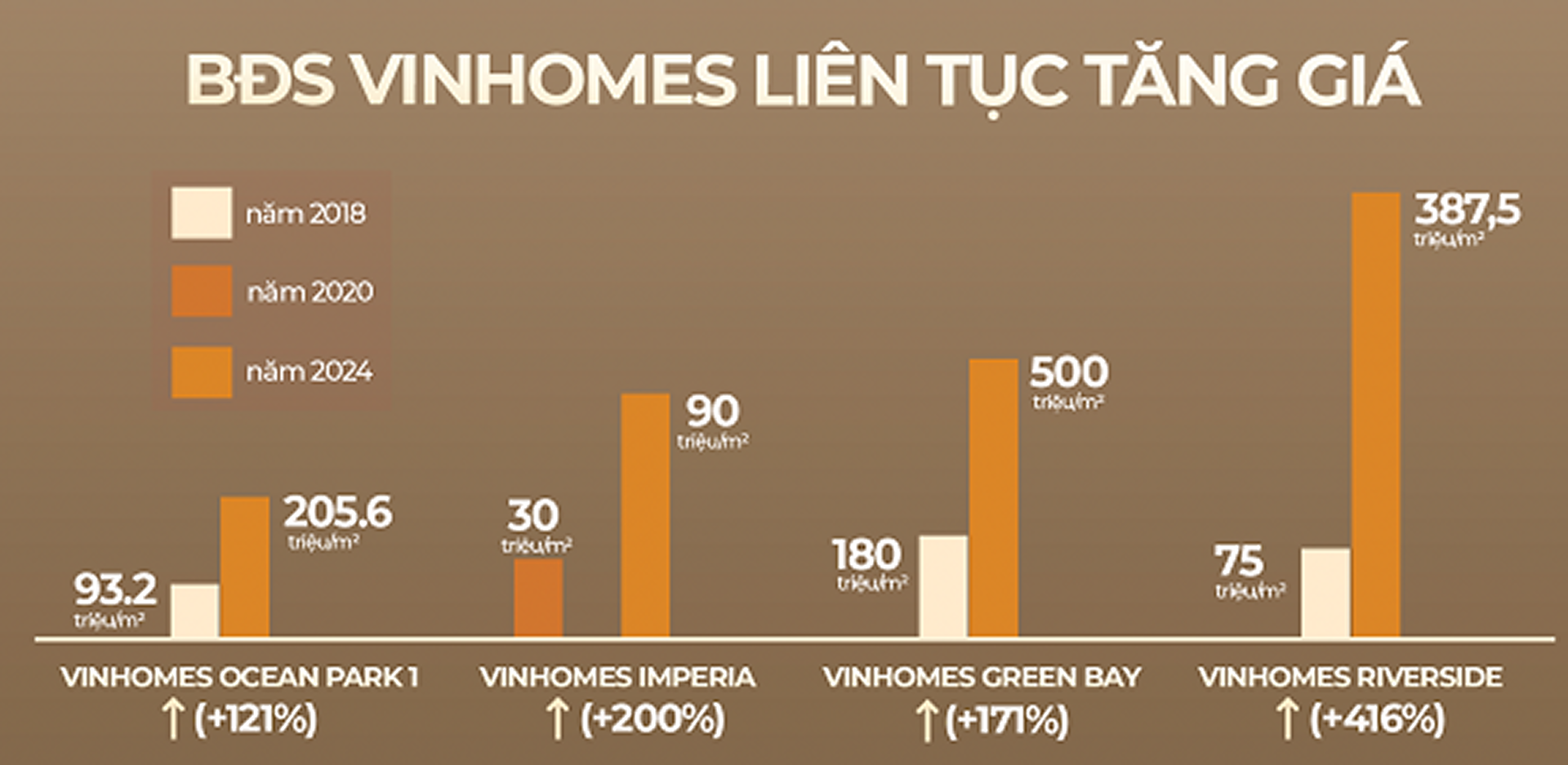 Với nhiều nhà đầu tư, BĐS thấp tầng Vinhomes là “nguyên lý” thành công với mức giá tăng trưởng ấn tượng và bền bỉ trong nhiều năm. Chương trình cam kết lợi nhuận mới đây của “ông lớn” số 1 thị trường BĐS càng khiến giới đầu tư vững tin về khả năng sinh lời nhân đôi, nhân ba tại các dự án Vinhomes.